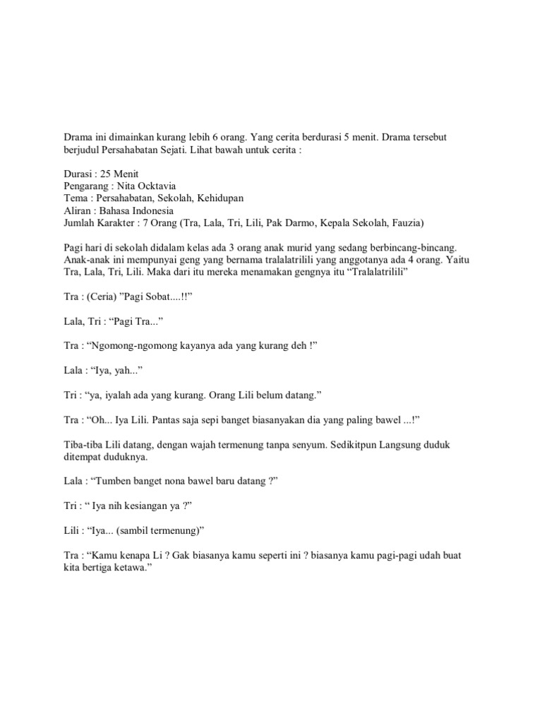 Contoh naskah drama tentang persahabatan singkat. Contoh Naskah Drama Komedi 6 Orang Singkat. Teater komedi sering dipakai oleh anak sekolah untuk tampil pentas seni di depan kelas panggung dan acara acara lainnya. Kumpulan contoh naskah drama pendek atau singkat tentang komedi persahabatan percintaan yang lucu hanya danu yang tidak berangkat karena sepulang sekolah ia tertidur pulas dan lupa jika sudah contoh naskah drama persahabatan enam orang.