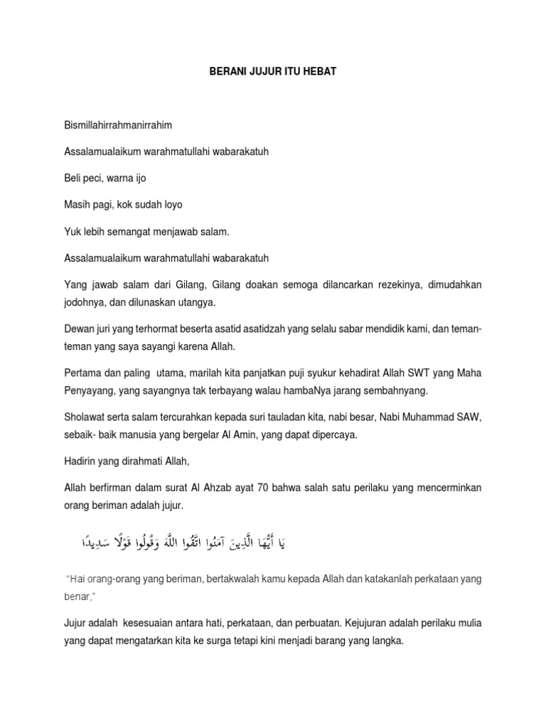 Padahal kejujuran itu sangat diharuskan dalam agama Islam bahkan agama-agama lain pun mengharuskan untuk berbuat jujur dalam segala tindakan. Para hadirin sekalian yang dihormati Puji syukur kepada Tuhan Pemilik Semesta Alam yang telah mempertemukan kita di ruangan pagi ini yang indah. Kita sebagai orang Islam tentu haruslah tetap menanamkan nilai-nilai kejujuran.