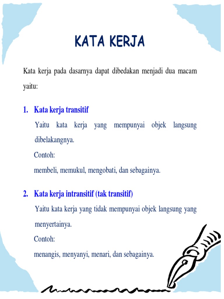 Penggolongan kata kerja tersebut juga berlaku dalam bahasa Indonesia. Daftar Kata Kerja Verba dalam Bahasa Indonesia memerosot memerosot Verba kata kerja meluncur ke bawah abdas. Sehingga dapat disimpulkan bahwa definisi kata kerja verb adalah kata yang memiliki fungsi untuk menjelaskan dan menunjukkan suatu tindakan seseorang subjek.