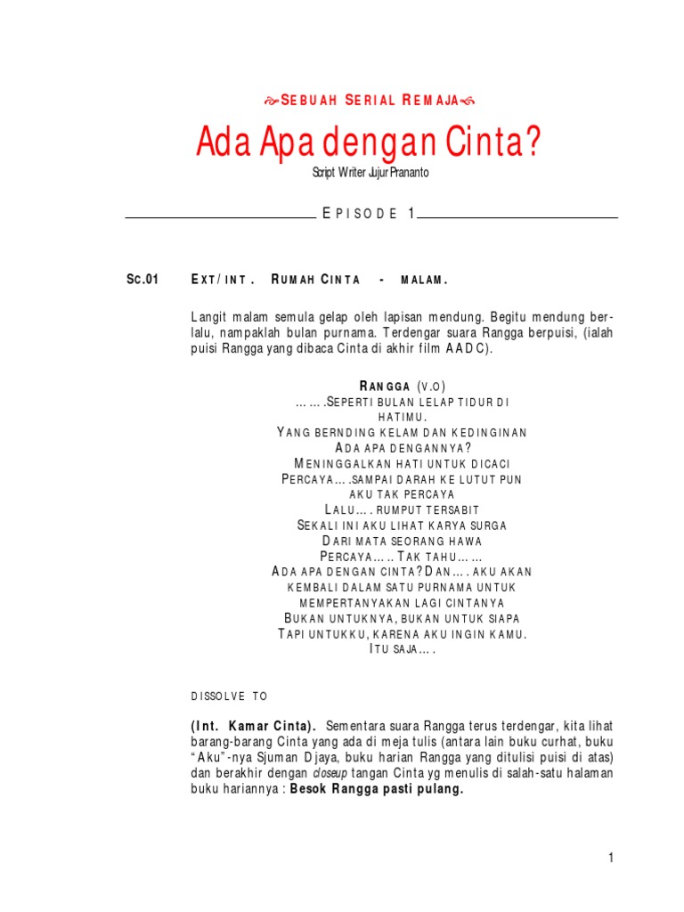 Berikut Merupakan 3 Puisi Di Film Aadc 1 Ada Apa Dengan Cinta 1. Kumpulan Puisi Romantis Cinta Dan Rangga Di Film AADC Ada Apa Dengan Cinta 1 dan 2 Film Ada Apa Dengan Cinta atau bisa disingkat AADC merupakan film yang dirilis tahun 2002. Konon kabarnya buku ini harus cetak ulang di hari pertama rilisnya 28 April 2016.