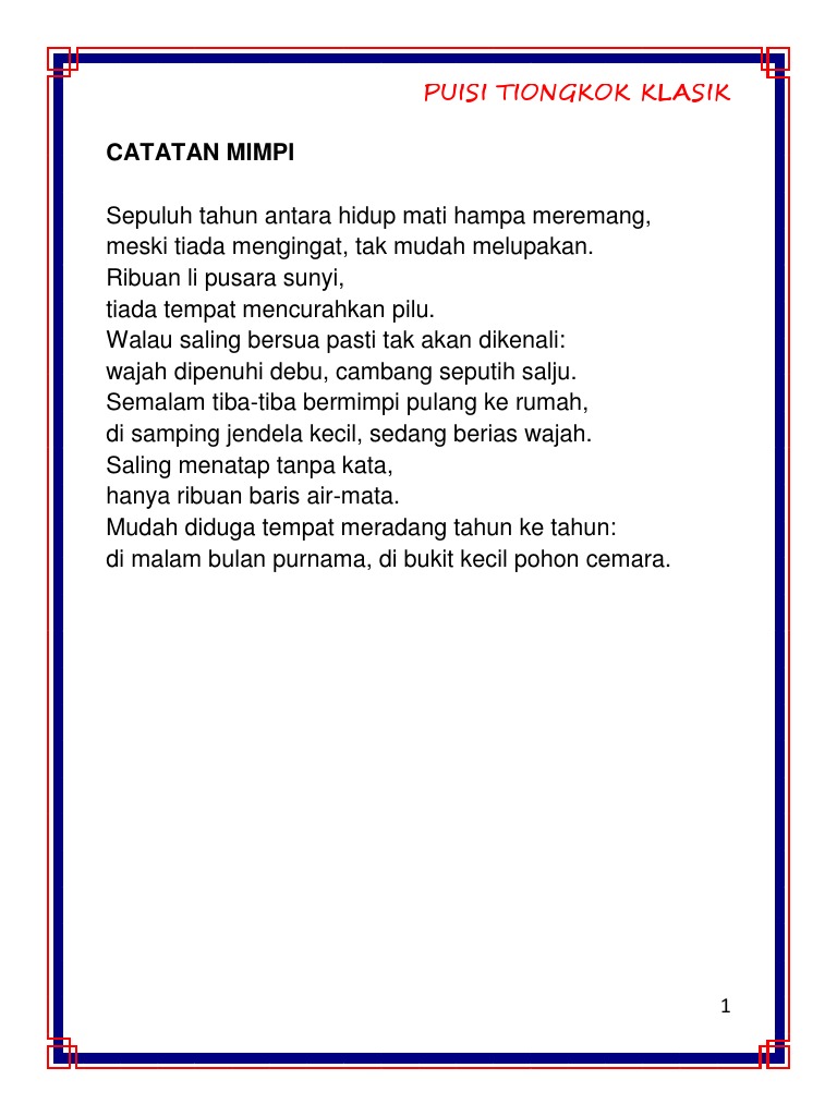 Puisi ceritera dan artikel berbahasa tionghua Aris Tanone Empat sajak di bawah ini adalah kumpulan sajak Li Bai berjudul 月下獨酌四首 Yue4 Xia4 Du2 Zhuo2 Si4 Shou3 atau Empat Judul Meneguk Sendiri Bersama Rembulan. PUISI JAWA MODERN - Staff Site Universitas Negeri Yogyakarta. Bao Zheng BAO Zheng lebih dikenal dengan gelar bahasa daerahnya Lord Bao atau Justice Bao adalah seorang tokoh sejarah dan pejabat pemerintah yang hidup di Dinasti Song Utara 960-1127.