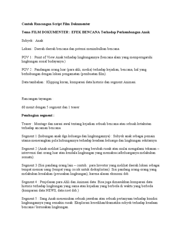 Dokumenter merupakan sebuah karya yang netral. July 3 2013 September 2 2013 hanifahtejarakhila. Contoh Rancangan Script Film Dokumenter.