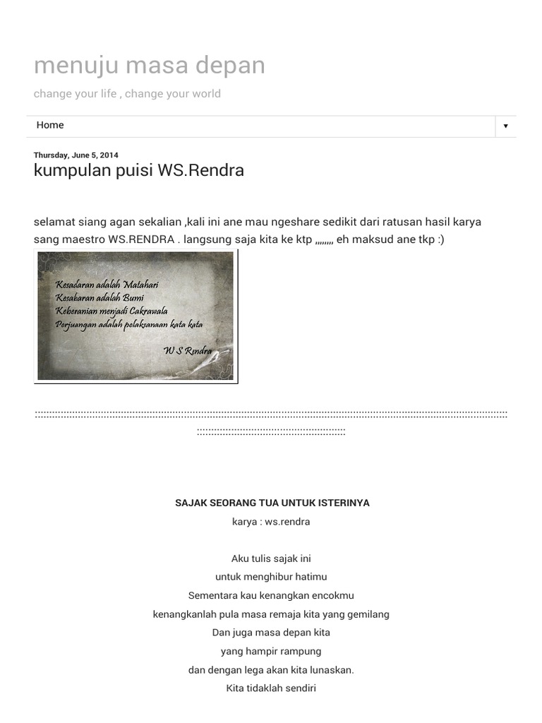 20 Contoh Puisi Pendek Terbaik Penuh Makna. Meskipun Rendra sudah mulai menulis sajakpuisi mulai tahun 1952-an namun puisi-puisinya pada tahun 1950-1960-an masih nampak biasa-biasa saja dengan tema seputar cinta Tuhan dan kehidupan. Kumpulan puisi karya ws rendra aku tulis pamplet ini - ws rendra bahwa kita ditatang seratus dewa - ws rendra doa seorang serdadu sebelum berperang - ws rendra gerilya - ws rendra gugur - ws rendra hai kamu.