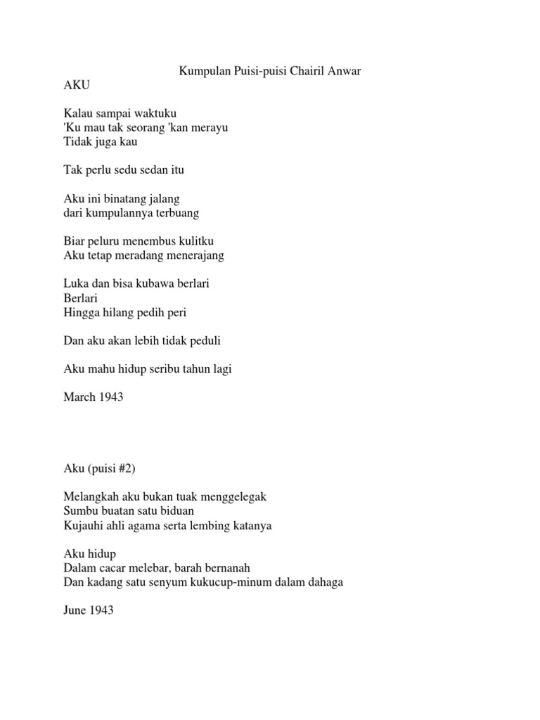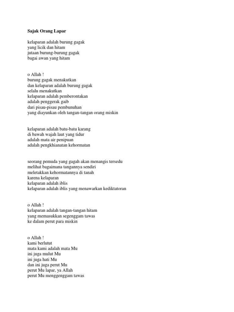 Kalian bisa menyerap makna dari setiap bait puisi dari WS Rendra dengan membaca maupun mendengarnya. Puisi juga mempunyai banyak jenis seperti puisi cinta puisi rindu puisi sahabat dan salah satunya adalah puisi pendek yang akan. Cyprianus Sugeng Brotoatmodjo dan Raden Ayu Catharina IsmadillahAyahnya adalah seorang guru Bahasa Indonesia dan Bahasa Jawa pada.