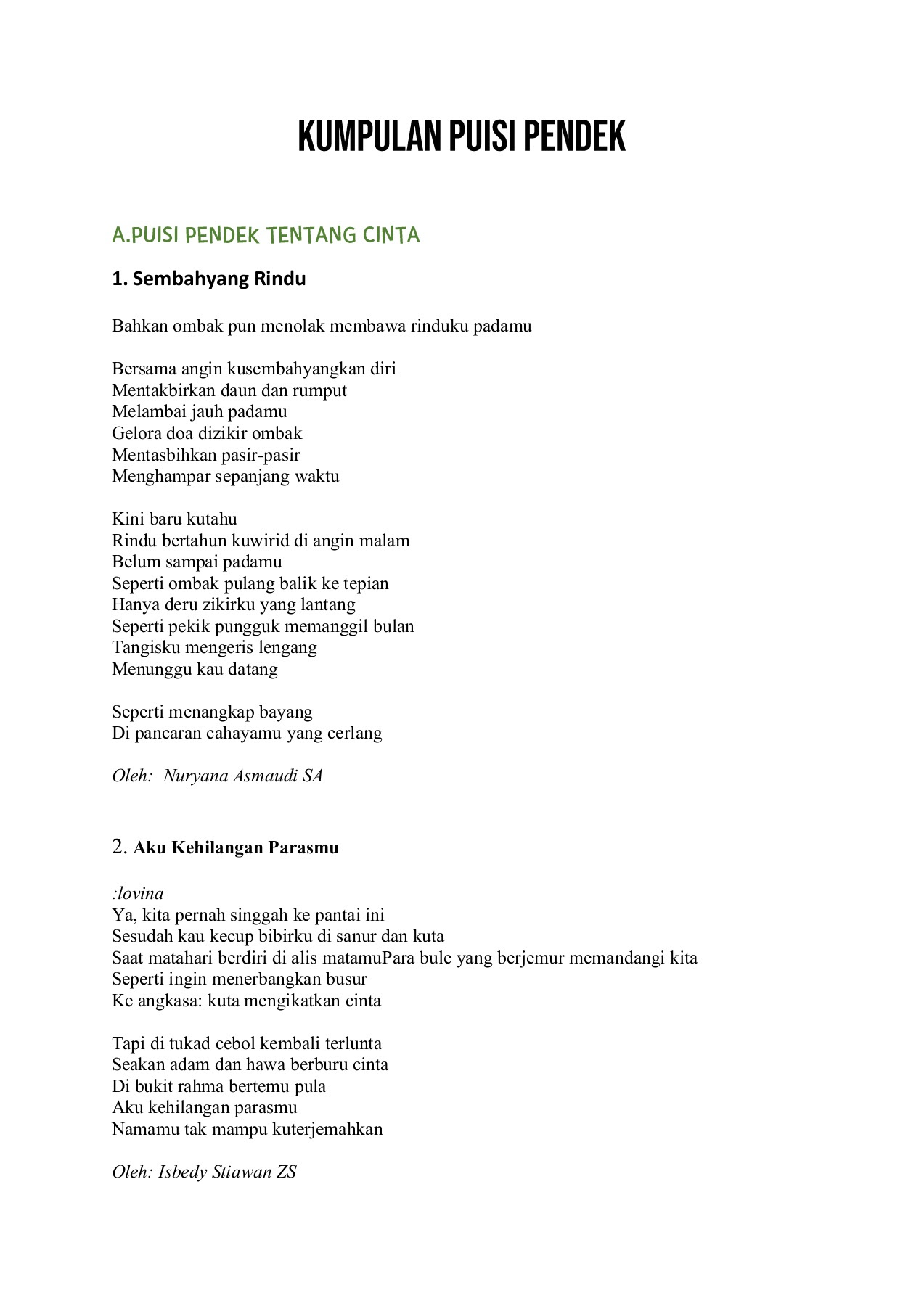100 Kumpulan Contoh Puisi Pendek Lama Baru dan Kontemporer Lengkap Contoh Puisi Setiap orang memiliki ekspresi yang berbeda terhadap lingkungannya. 1630 likes 1 talking about this. 217 Surat Cinta untuk Emak.