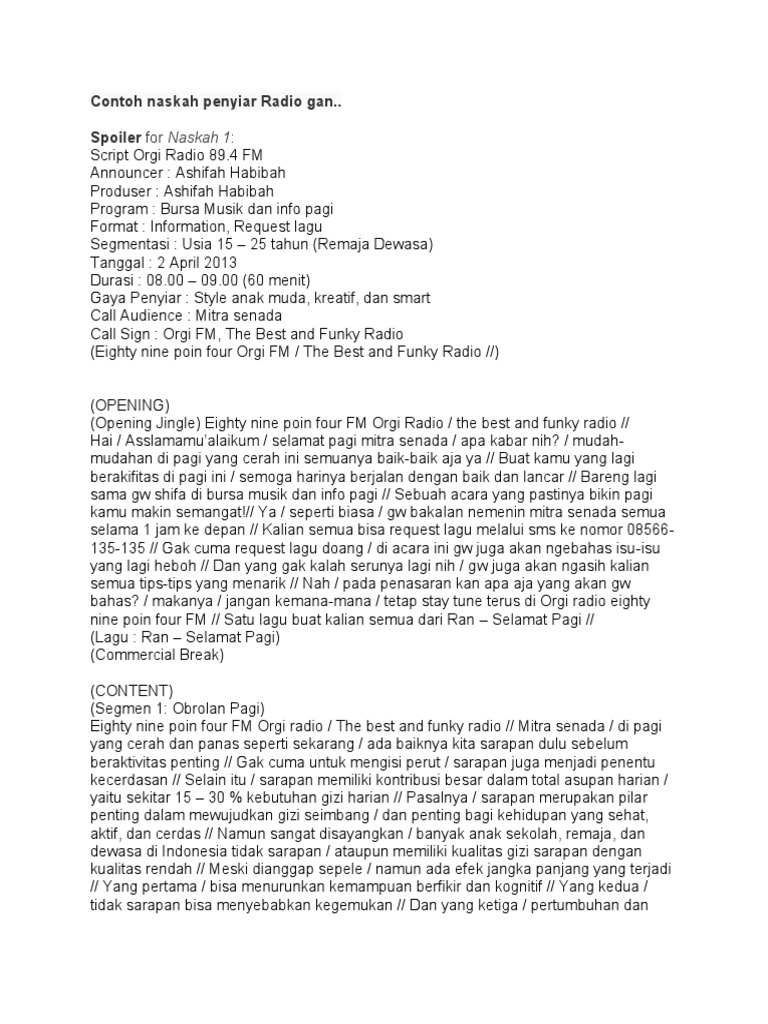 Pertanian Bioindustri Berbasis Tanaman Dan Ternak Ramah Lingkungan Bentuk. SB2 Smk Bisa Broadcasting Lagu 1300 1304 Cholestrol bukan yang terbaik Opening Assalamualaikum WrWb. Naskah siaran atau skrip adalah materi siaran yang akan disampaikan penyiar dalam bersiaran terutama siaran dengan teknik membaca naskah dan siaran berita.