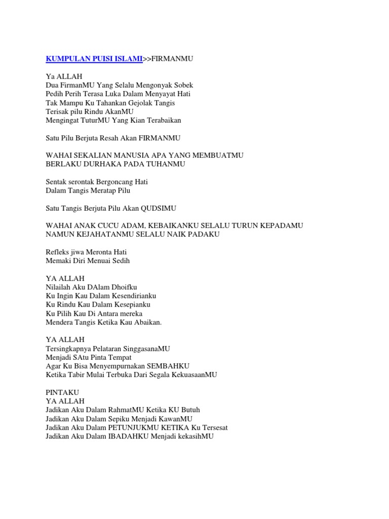 Kumpulan puisi islam teater gress surabaya jun 13 2008 - kumpulan puisi islam. Puisi islami hampir sama seperti puisi pada umumnya yang membedakannya hanya pada temanya. Kumpulan Puisi Islami Lengkap is in the category of Books Reference.