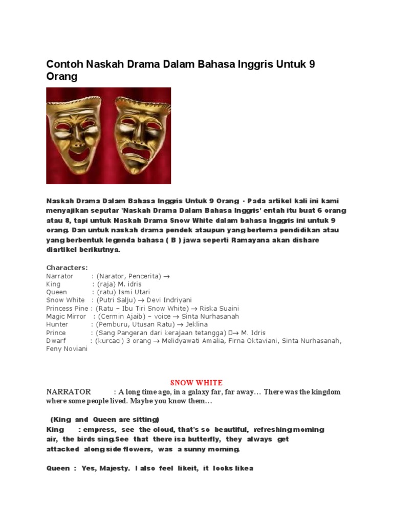 Kedua adalah pilih naskah yang menggambarkan kharakter suara kita contohnya adalah kalo suara kita berat atau kita bisa voice akting maka kita bisa memilih naskah seperti film trailers atau naskah film animasi. Contoh Naskah Drama Dalam Bahasa Inggris 8 Orang Tentang Cerita Rakyat Hi Sahabat-Sahabat SBI pada kesempatan kali ini saya akan memberikan contoh naskah ada sebuah drama yang dibuat oleh sebuah kelompok makahasiswa seni pertunjukan dari Pendidikan Bahasa dan Sastra Inggris di Universitas Lampung. The local time now is 20 minutes past 11 am.