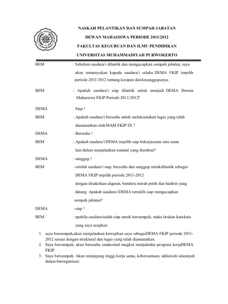 Naskah Pelantikan Dan Sumpah Jabatan Dema Fkip