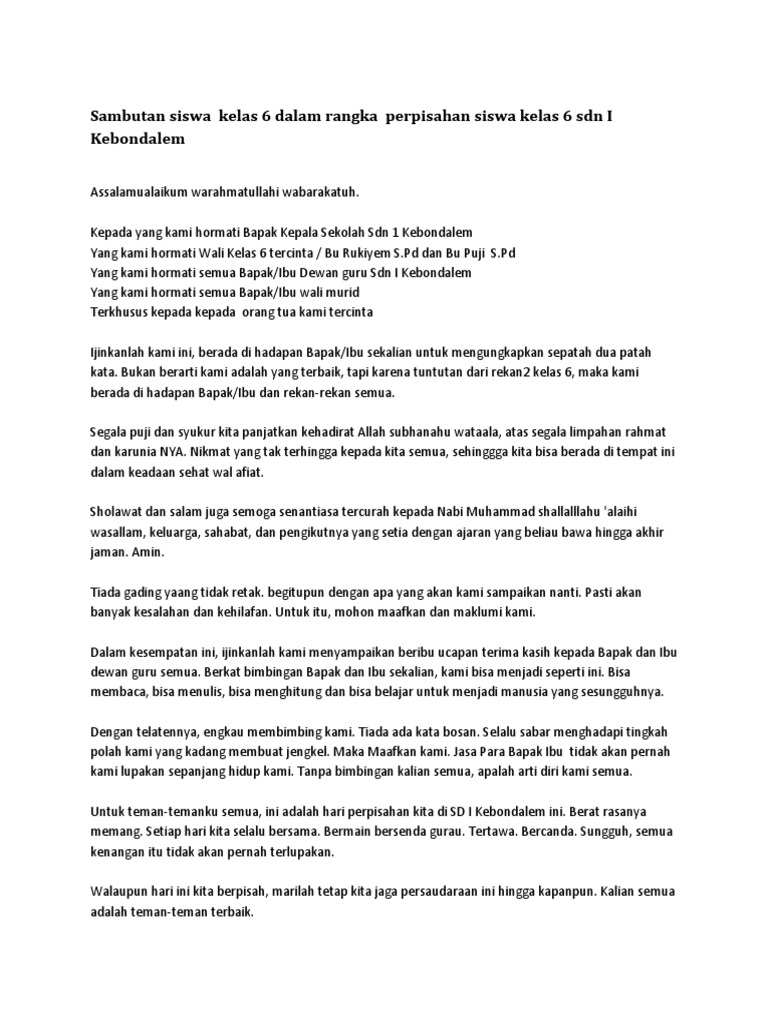 Sambutan Perwakilan Kelas 6 dalam Acara Perpisahan Kelas 6. Dan apabila ada kekurangan kekeliruan kata dalam penulisan sambutan perpisahan kelulusan oleh wali kelas ini kalian berhak mengedit naskah pidato ini atau menambahkan kata-kata agar lebih baik dan lebih sempurna lagi menurut kalian. Assalamu alaikum warahmatullahi wabarakatuh Yang terhormat bapak kepala sekolah MTs As-Syafiiyah 04 Yang terhormat bapak kepala Yayasan Perguruan Islam as-Syafiiyah cabang Cilangkap Yang terhormat Bapak Pengawas Madrasah Tsanawiyah kankemenag kota Jakarta Tmur Yang terhormat wali murid kelas IX dewan guru beserta staf dan anak-anaku sekalian yang berbahagia Alhamdulillah.