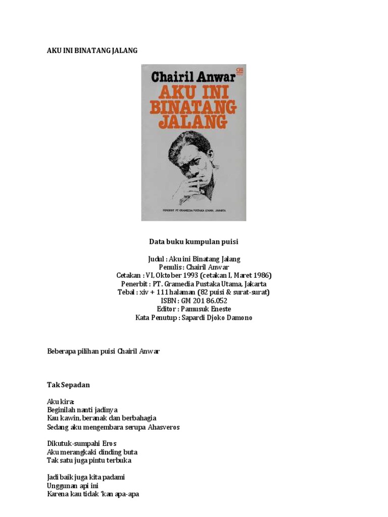 Get Free Aku Ini Binatang Jalang Chairil AnwarLama Song of Aku by Chairil Anwar Aku Ini Binatang Jalang Chairil Dalam buku hardcover bersampul maron kolaborasi warna kopi berjudul AKU INI BINATANG JALANG - CHAIRIL ANWAR dengan cover depan potret sang penyair yang khas mendunia. Sebagian lagi ada dalam Tiga Menguak Takdir dan Chairil Anwar Pelopor Angkatan 45. Puisi aku-lirik yang religius pada kumpulan sajakAku Ini Binatang Jalangkarya Chairil Anwar dapat disimpulkan puisi-puisi di atas layak dijadikan bahan ajar sastra di SMAMA.