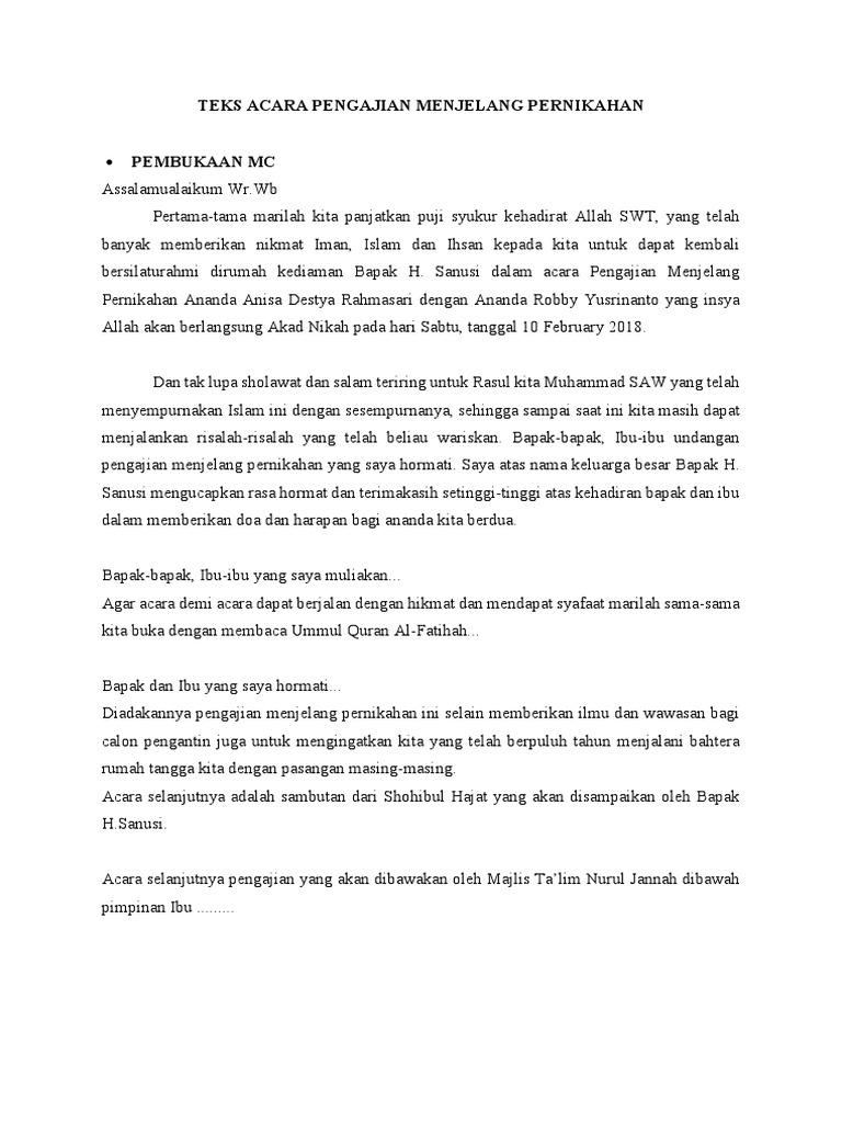 Contoh Teks Pembawa Acara Pengajian. Alhamdulillah puji dan syukur kita panjatkan ke hadirot Allah SWT yang telah memberikan kita nikmat termasuk nikmat kesehatan dan kesempatan sehingga kita dapat menghadiri pengajian mingguan ini. Naskah Pembawa Acara Dalam Pengajian.