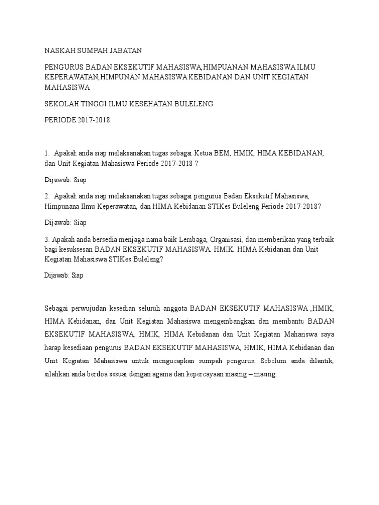 Ketua dpm ft 3. Naskah pelantikan dan sumpah jabatan dewan pengurus mahasiswa pecinta alam yayasn pendidikan makassar PERIODE 20162017 Sebelum saudara dilantik dan mengucapkan sumpah jabatan saya akan menanyakan kepada saudara selaku BADAN PENGURUS terpilih periode 20162017 tentang kesipan dan kesanggupanya. 18845k 33 pmd 2017 hari rabu tanggal 8 nopember 2017 tentang.