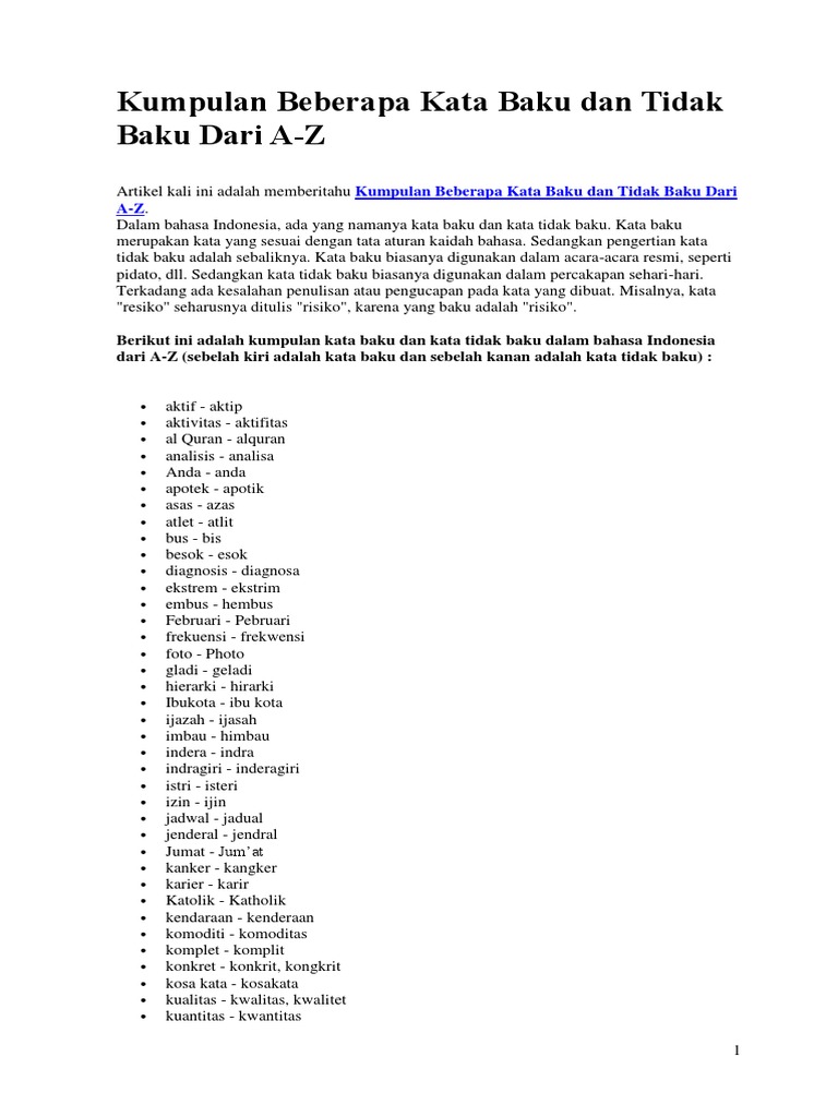 Kumpulan kata baku pdf. Standarkriteriakaidah penulisan buku teks bahasa yang. Kumpulan Kata Baku dan Tidak Baku Kata Baku TIdak Baku abad ada adapun adjektiva afiks afektif agresif Akhir Mengakhiri Mengakhirkan Diakhiri Akhirat Akhlak Akta Aktif abat abad adah ada pun ajektiva afik aviks affektif avektif efektip agresip agressif ahir akir mengahiri meng akhiri mengahirkan meng akhirkan diahiri di akhiri akherat ahirat. Kata-kata Verbal biasanya digunakan pada saat test lamaran pekerjaan atau pada tes ingin memasuki dunia perkuliahan seperti tes beasiswa atau perguruan negeri tinggi PTN.