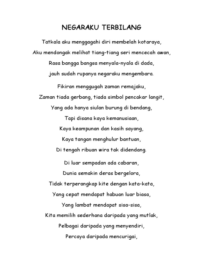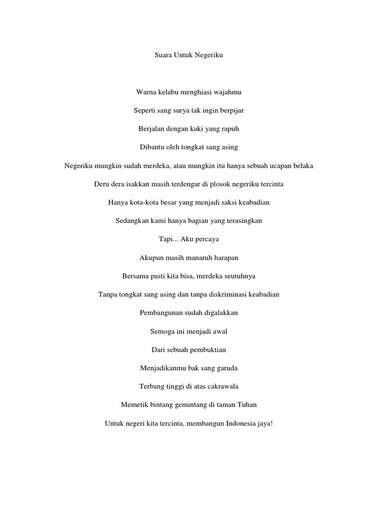 422 avg rating 3792 ratings. Negaraku Indonesia Negaraku Indonesia Indah dan permai Bagiku oh Sekali Indonesia tetap Indonesia Tak kan pernah tergantikan Ku tetap semangat Walau Belanda menjajahmu Aku kan membelamu sepanjang masa Indonesia negaraku Yang setia dan kucinta Karya. Puisi absurd dariku untukmu Indonesia.