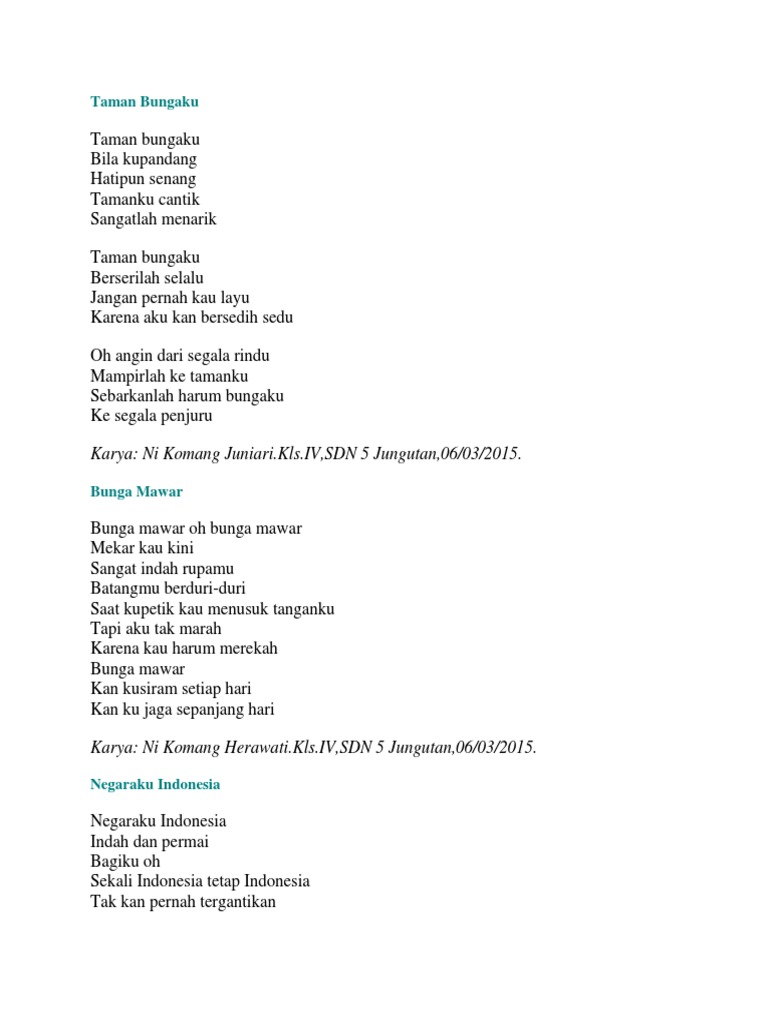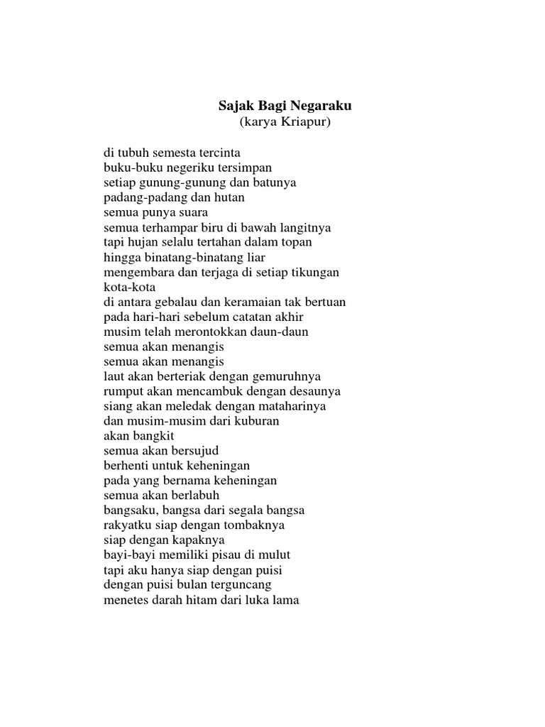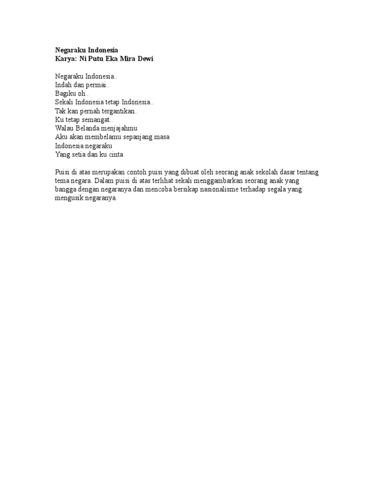 Kumpulan puisi puisi negaraku indonesia. 18 Juni 2017 1850 15902 0 0 2 Menit Baca Mohon Tunggu. Puisi sajak bagi negeriku karya kriapur Pengertian puisi adalah suatu karya sastra tertulis dimana isinya merupakan ungkapan perasaan seorang penyair dengan menggunakan bahasa yang bermakna semantis serta mengandung irama rima dan ritma dalam penyusunan larik dan baitnya. Ni Putu Eka Mira DewiKlsIVSDN 5 Jungutan06032015.